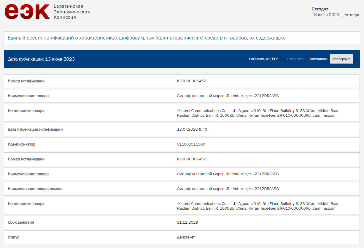На сайте Евразийской экономической комиссии (EEC, ЕЭК) сегодня появилась запись о новом смартфоне компании Xiaomi, выпущенным под её дочерним брендом Redmi и получившем каталожный номер 2312DRAABG. То есть, данный аппарат готов к продаже на территории России и других стран, входящих в ЕЭК.