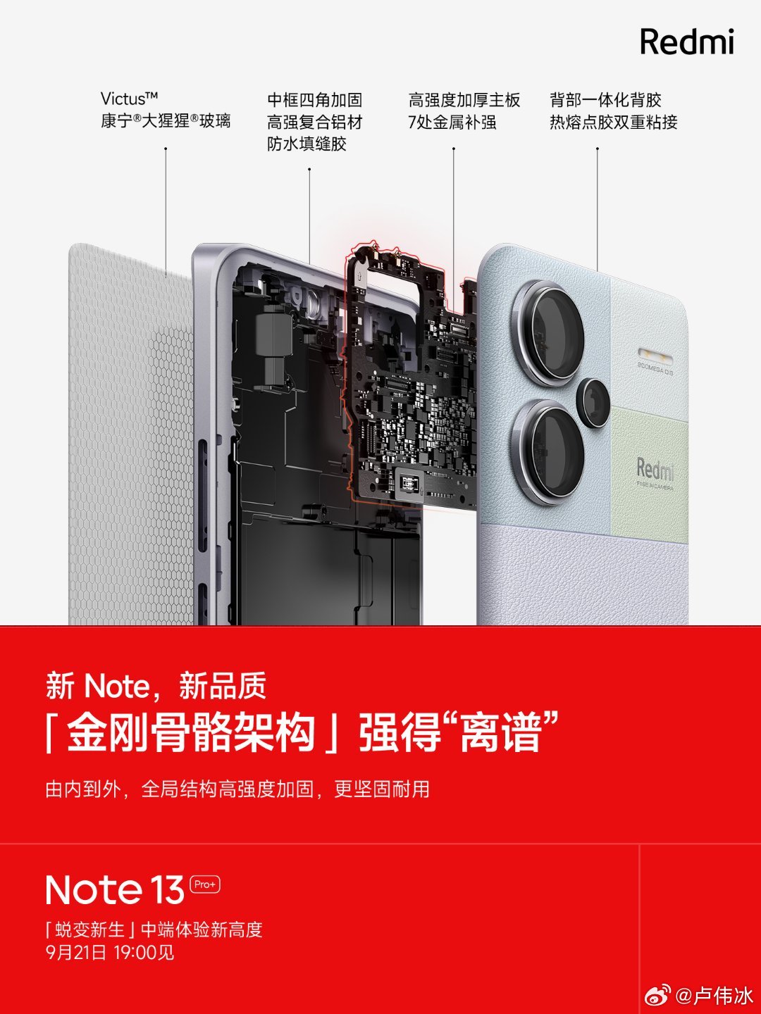 Помимо этого всё тот же Лу Вейбинг утверждает, что Redmi Note 13 Pro+ наделили усиленным корпусом с прочной рамой и её углами, а также семь общих усилений конструкции, которые делают смартфон прочнее.